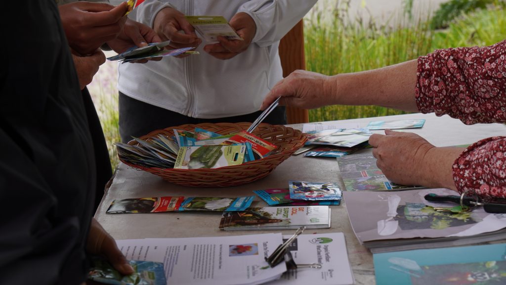 Laura distributed some plants such as tomatoes, eggplant, jalapeno, and more with the group. She also offered vegetable seeds and flower seeds along with some hangouts that she had brought with her.